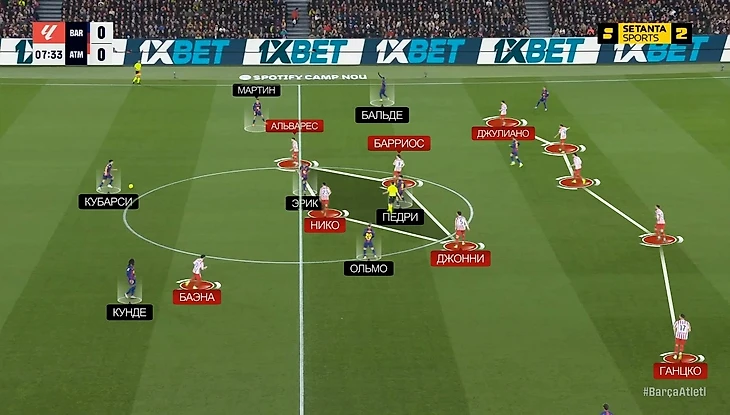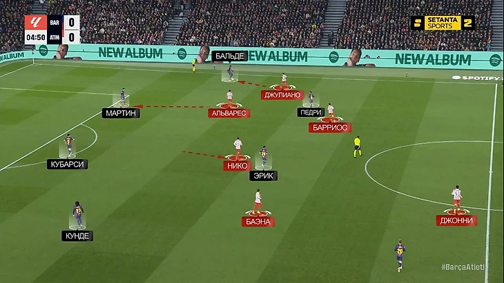 В среднем/низком блоке Джулиано Симеоне садился в заднюю линию и образовывал пятерку. Акцент «Атлетико» делал на перекрытии центра: Джонни, Барриос, Альварес и Нико/Баэна компактно закрывали Эрика, Педри и Ольмо – перевес 4-на-3: