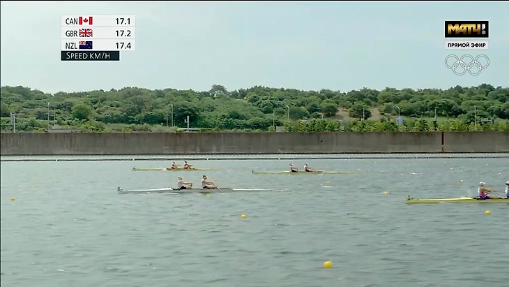 Ничего страшного – возможно, акцентировали внимание на соперничестве Канады и Новой Зеландией. Вот только потом показали текущую скорость лидеров – без России, которая шла вровень с британцами (хотя на этом отрезке Степанова и Орябинская уже ускорились).