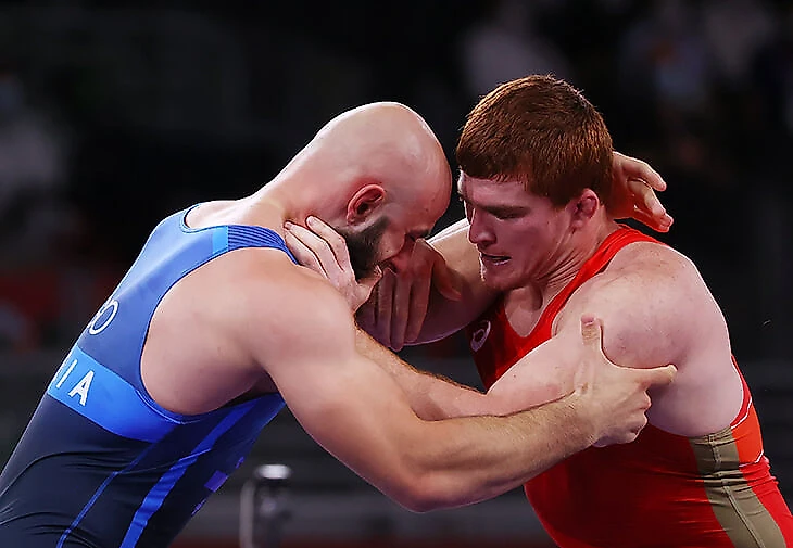 6:47. Первый четвертьфинал в греко-римской борьбе (до 97 кг) – это Муса Евлоев, он скоро выйдет на ковер C против венгра – смотрим тут на сайте Первого.