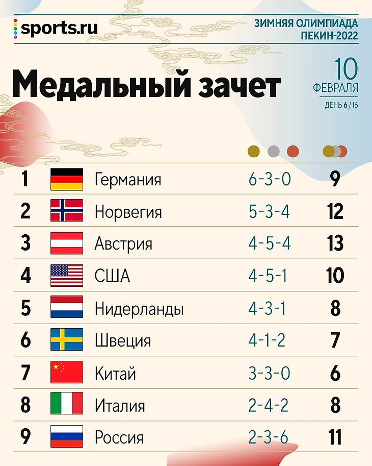 Пока все выглядит так - олимпийская сборная России идет 9-й в зачете.
