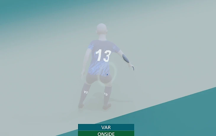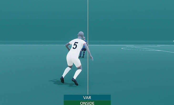А тут линию по японке нарисовали. Естественно, там только точка. Так и надо рисовать оффсайдную линию. Через самую ближайшую к воротам точку тела, которой можно забивать (т.е. кроме рук).