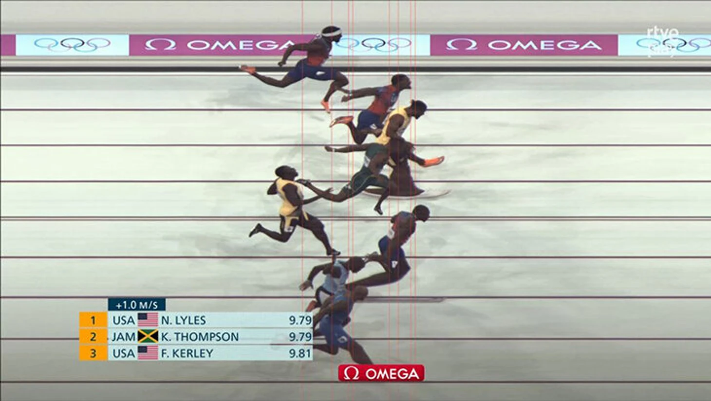 🥇 Ноа Лайлс (США) – 9,784 🥈 Кишан Томпсон (Ямайка) – 9,789 🥉 Фред Керли (США) – 9,81