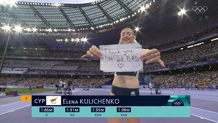 Перемещаемся на «Стад де Франс». Девушки начали прыгать в высоту. Пока все просто берут стартовые 1,86. В том числе Елена Куличенко – экс-россиянка и знаменосец сборной Кипра.