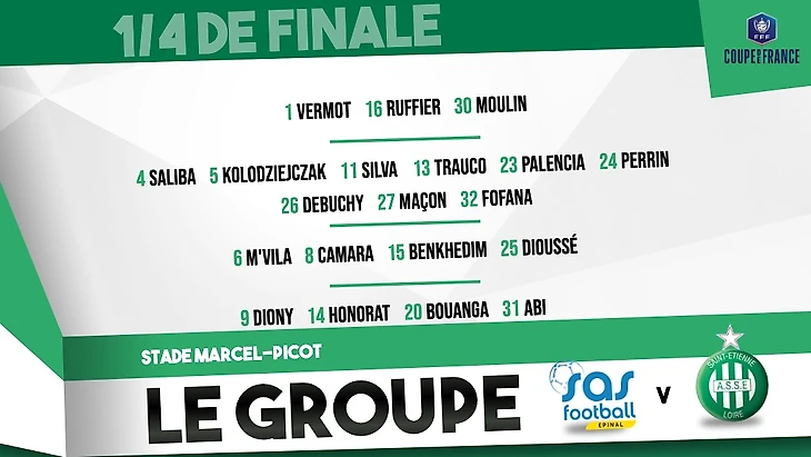 Сегодня пройдет завершающий матч стадии четвертьфинала кубка Франции. В этой игре встретятся "Эпиналь" и "Сент-Этьен". Встреча начнется в 23-00, увидеть ее вы можете в прямом эфире на телеканале Футбол или в группе Vk телеканала https://vk.com/footballtv_ru .