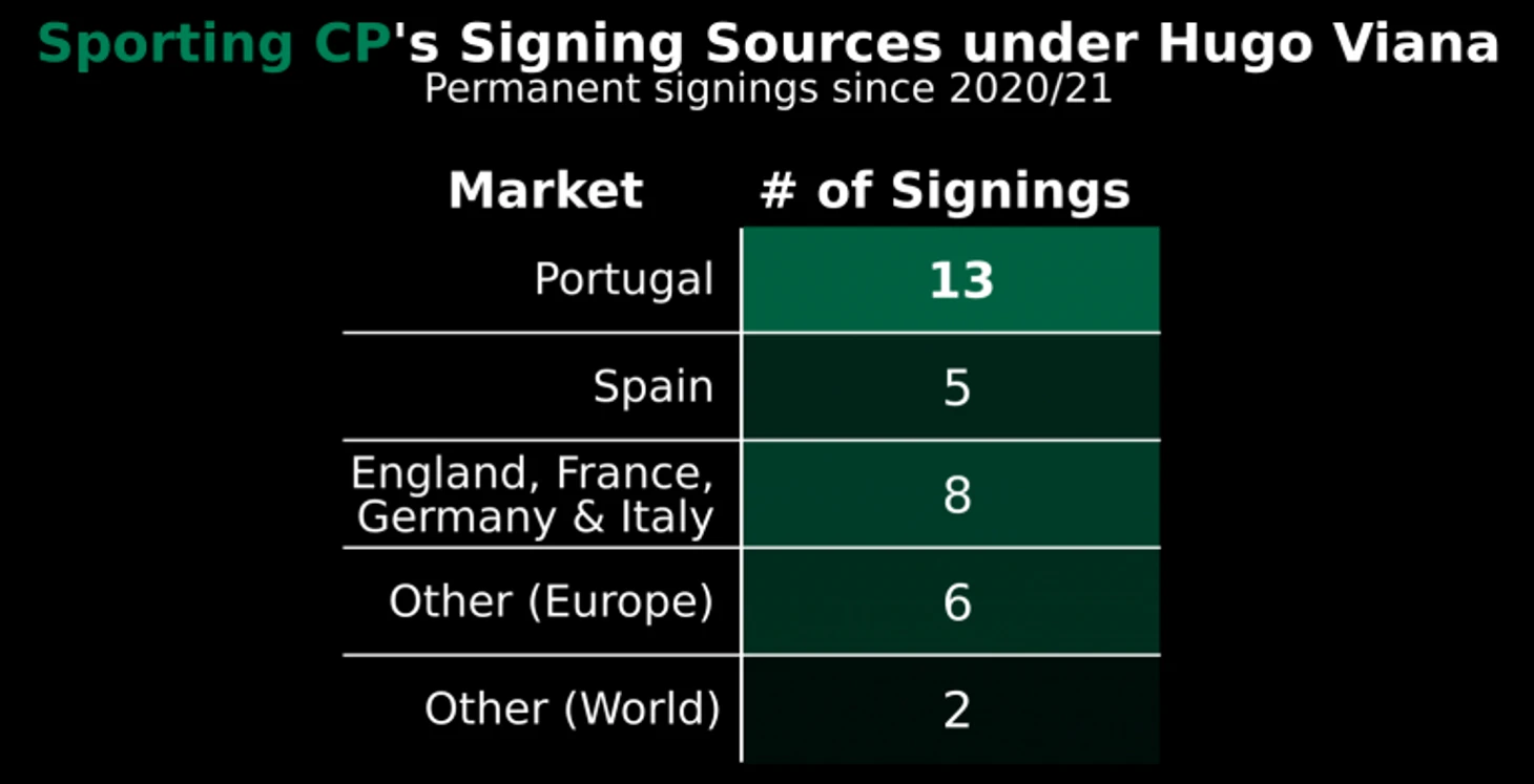 Интересно, но «Спортинг» при Виане работает в основном только с «проверенными» рынками, в особенности, с внутренним. Более трети от общего числа трансферов пришлись на рынок Португалии. Виана опирался на внутренний рынок особенно сильно в рамках своих первых трансферных окнах в качестве спортивного директора «Спортинга». К примеру, три из шести трансферов летом 2020 года были из Примейры, а ещё два – из Испании – страны Пиренейского полуострова. Следующие шесть трансферов были исключительно из команд Примейры, включая Паулинью и Угарте. Основной принцип – приглашать игроков, уже адаптированных к португальской высшей лиге, а также вовремя забирать талантливую молодёжь из более скромных местных клубов.