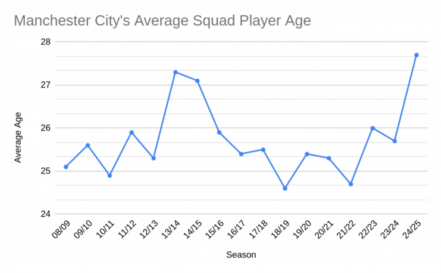 Помимо глубины состава, Виане нужно будет обратить внимание и на средний возраст игроков стартового состава «горожан»: в лучшие сезоны средний возраст останавливался на отметке около 25-ти лет. В прошлом сезоне средний возраст игроков стартового состава был 25.7 лет, тогда как в текущем – 27.7. Это худший показатель «Манчестер Сити» с тех пор, как шейхи пришли в клуб. Эдерсон (31 год), Стоунз (30 лет), Уокер (34 года), Ковачич (30 лет), Гюндоган (34 года), Силва (30 лет), Де Брюйне (33 года) – все они являются неотъемлемой частью стартового состава и главной причиной такого резкого «взросления» команды.