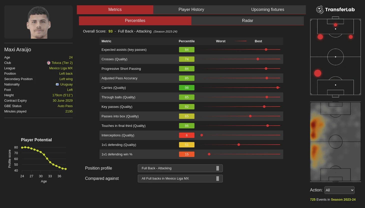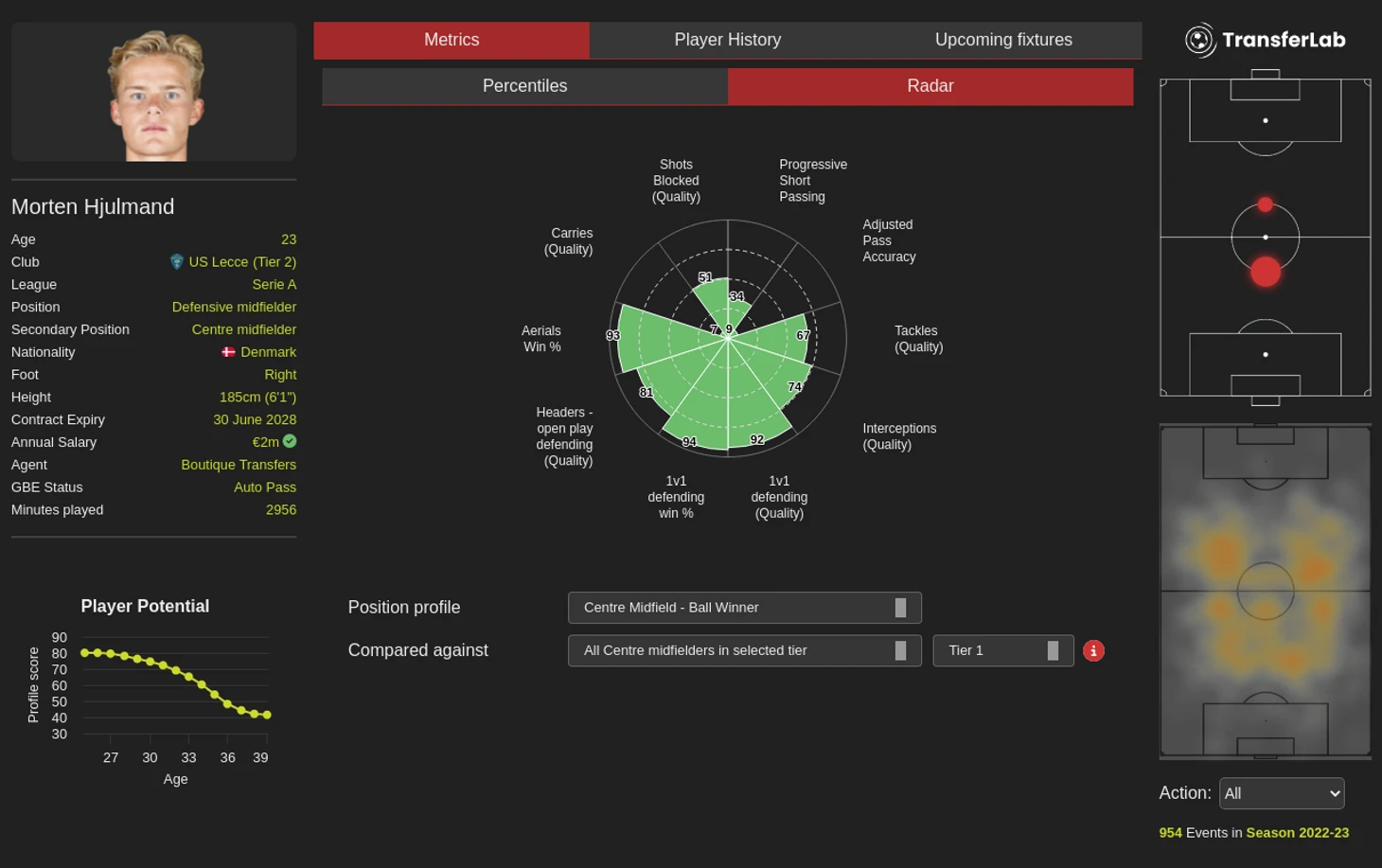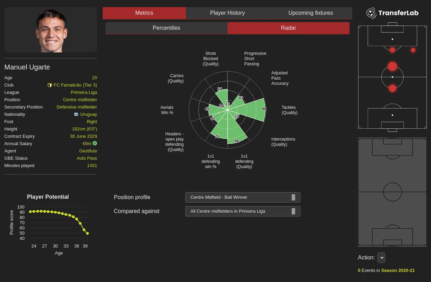 К примеру, после триумфального сезона 2020/21, по итогам которого «Спортинг» выиграл лигу, Кубок и Суперкубок Португалии, они подписали из «Фамиликана» Мануэля Угарте за рекордные для себя €24.5 млн. При этом, уругваец провёл всего полгода в Португалии, перейдя в «Фамиликан» из уругвайского «Феникса» за €9.1 млн в январе 2021-го года. За этот короткий промежуток времени он проявил себя и доказал скаутам и спортдиру «Спортинга», что он – лучший кандидат на роль опорного полузащитника, способного выиграть мяч у любого соперника. Профиль игрока в сезоне 2020/21 Вы можете видеть на графике ниже.