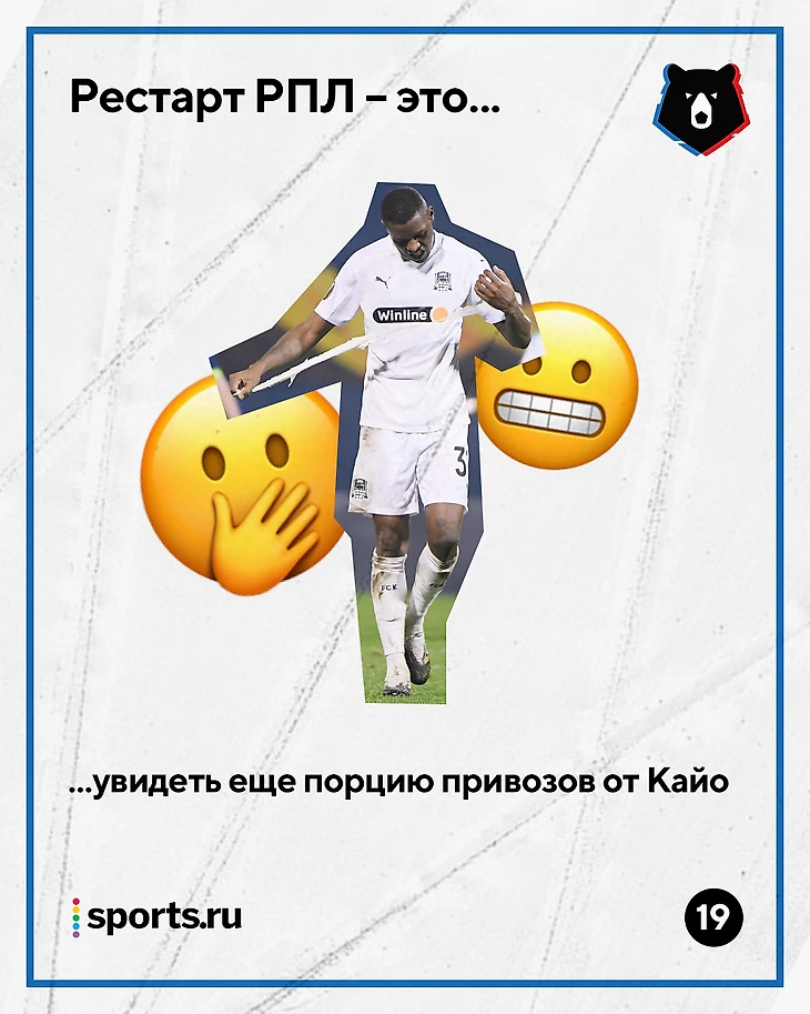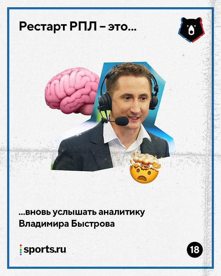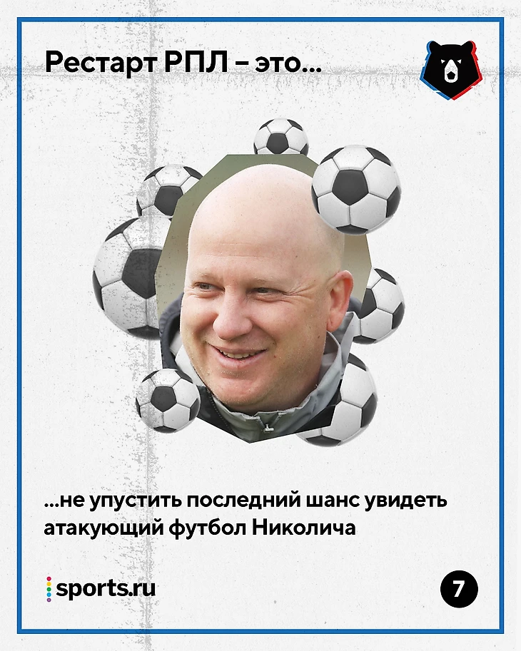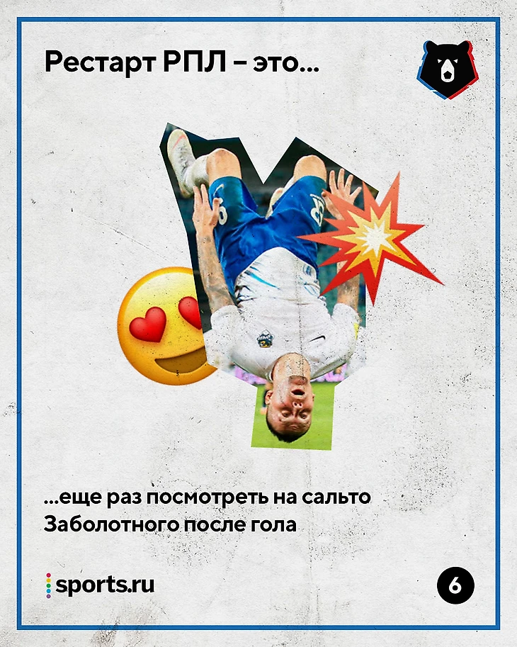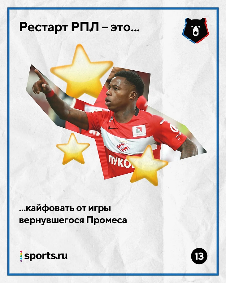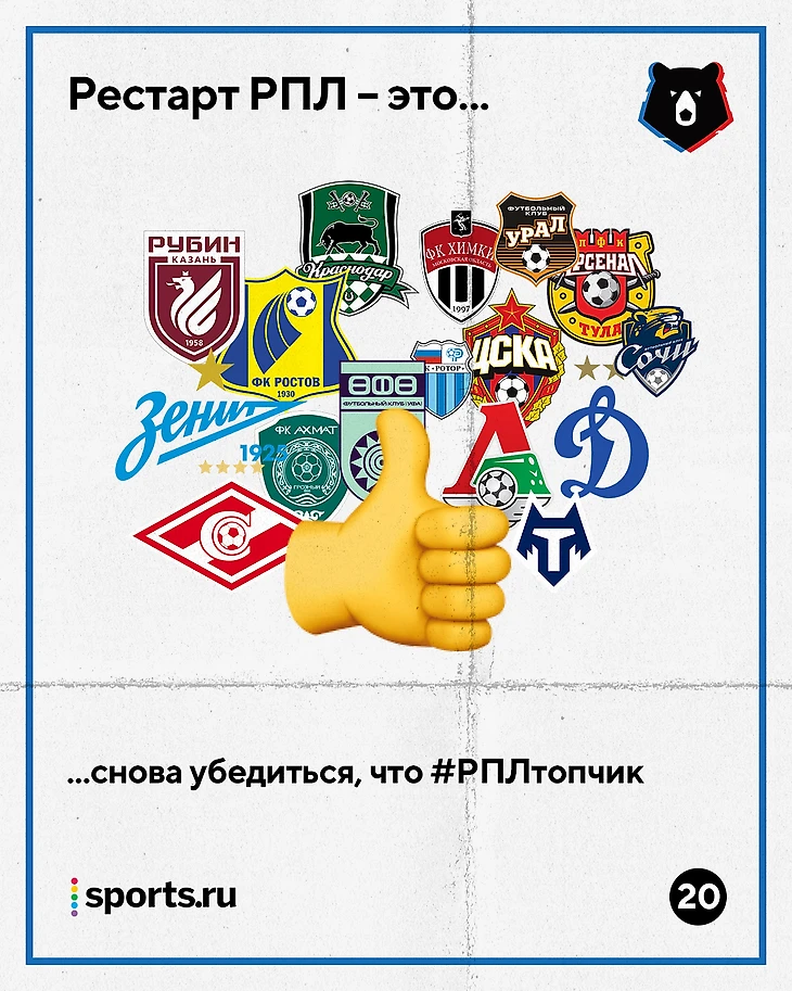 Мы очень ждали возобновления РПЛ и по этому поводу подготовили 20 карточек, на которых расписали причины следить за вернувшейся лигой и кайфовать от каждой игры. Обязательно посмотрите их все, а потом напишите в комментариях, почему вы ждали камбэк РПЛ и что хотите увидеть в матчах чемпионата сильнее всего.