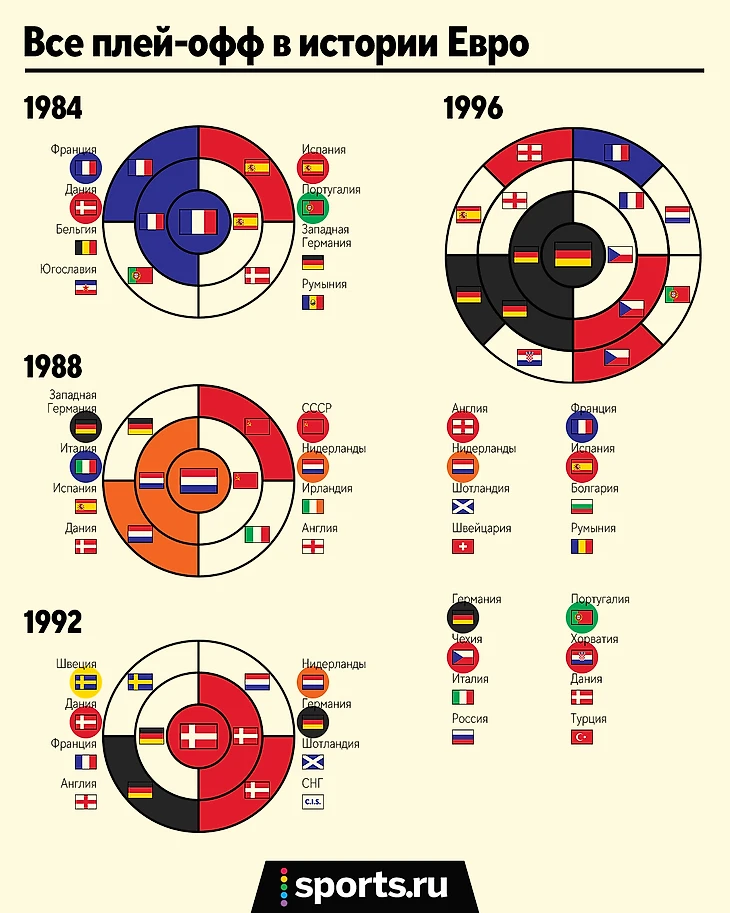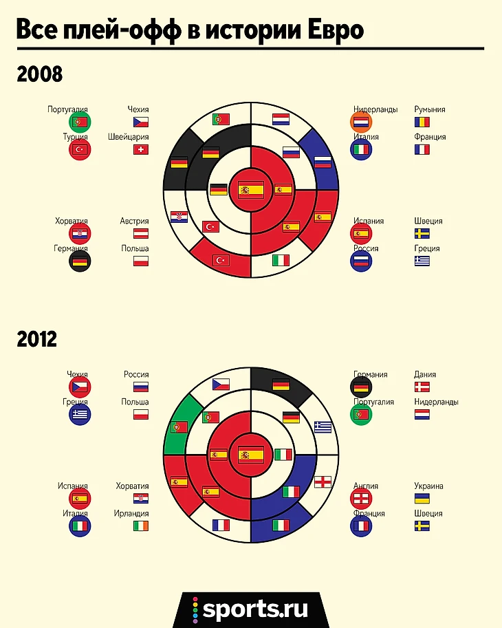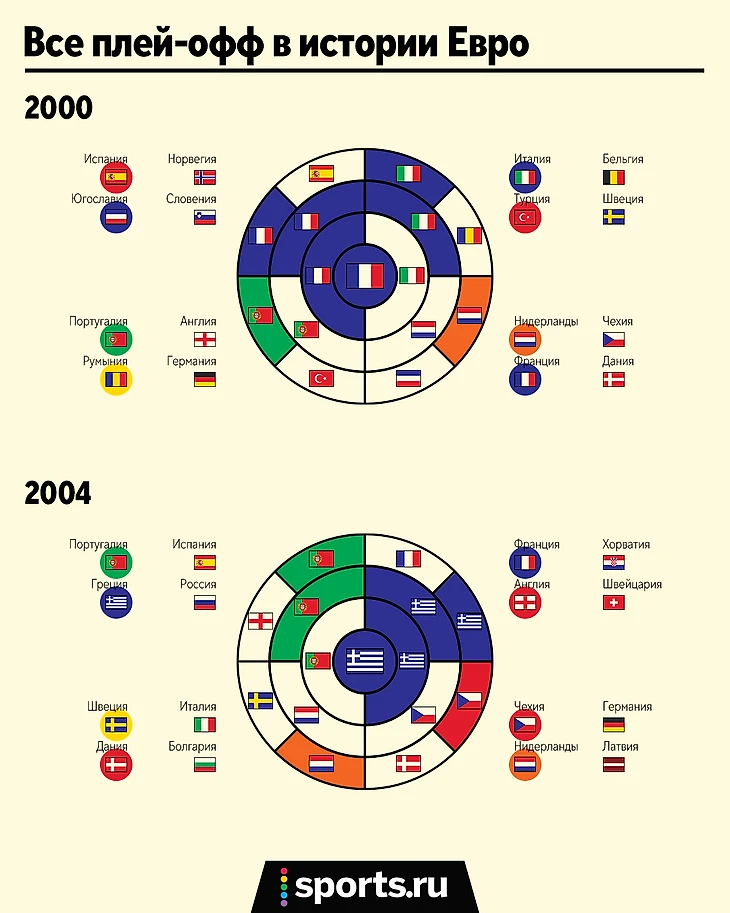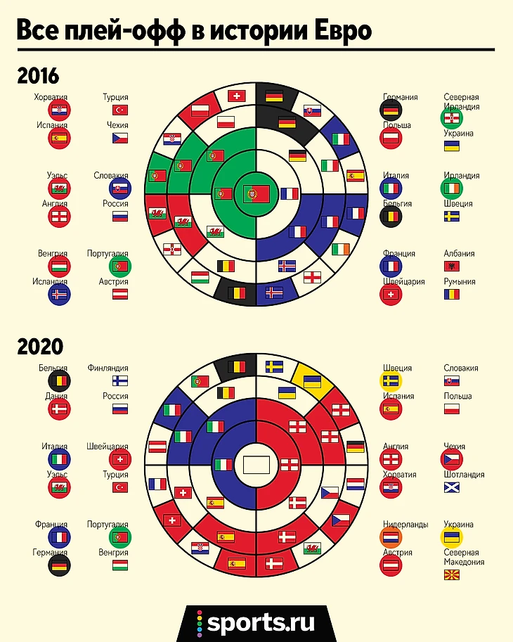 Это диаграммы! Но это не просто диаграммы, а диаграммы с участниками плей-офф всех чемпионатов Европы. Ну красота же? Красота! А ее автор – дизайнер Sports.ru Алексей Белоус. Подписывайтесь на его соцсети, там красоты еще больше.