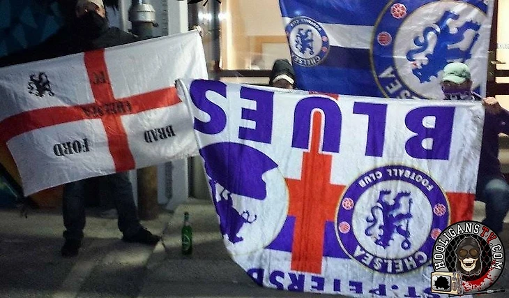 Хулиганы "Марибора" с отжатыми баннерами "Челси" в 2014 году:
