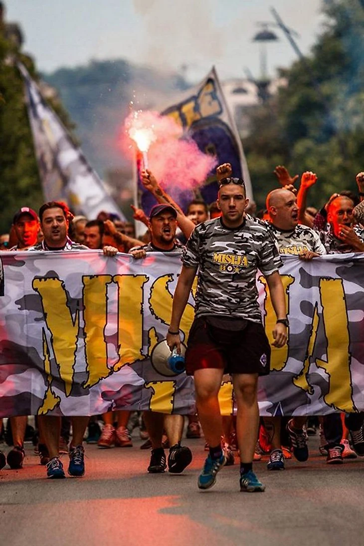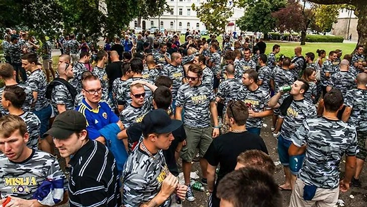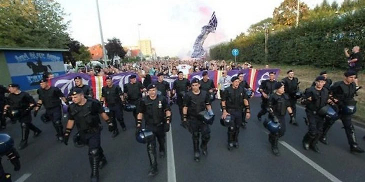 Теперь немного об околофутболе, ведь "Виоле Марибор", как и любая другая балканская движуха, занимается не только трибуной поддержкой, но и силовыми акциями за пределами стадиона. В конце 90-х хулиганизм в Словении переживал кризис, так как старое поколение хулиганов стало отходить от активных дел и многие банды просто исчезли по причине того, что в их составе не было хорошего костяка. На фоне этого "ВМ" на время потеряли достойных оппонентов, а вместе с ним и хулиганскую практику, поэтому они стали выбегать на поле для демонстративного сожжения отжатых трофеев, дабы хоть как-то попытаться спровоцировать соперников на стык. Подавляющее преимущество хулиганов "Марибора" продолжалось до середины 2000-х годов - тогда костяк хулиганов "Виоле Марибор" уже стал возрастным, но им удалось сохранить в строю часть олдскула, поэтому на тот момент у них был более возрастной состав, чем у главного оппонента - столичной "Олимпии". Матчи "Марибора" и "Олимпии" именуются как "вечное дерби" и редкие из них обходятся без околофутбольных движений. Но подавляющее большинство из них происходят не только между "Олимпией" и "Марибором", а еще и с вмешательством третьей, "серой" стороны. Так, например, 6 лет назад потасовка между фанатами "Марибора" и полицией на гостевой игре в Любляне завершилась тем, что на стадионе не досчитались более 300 кресел.