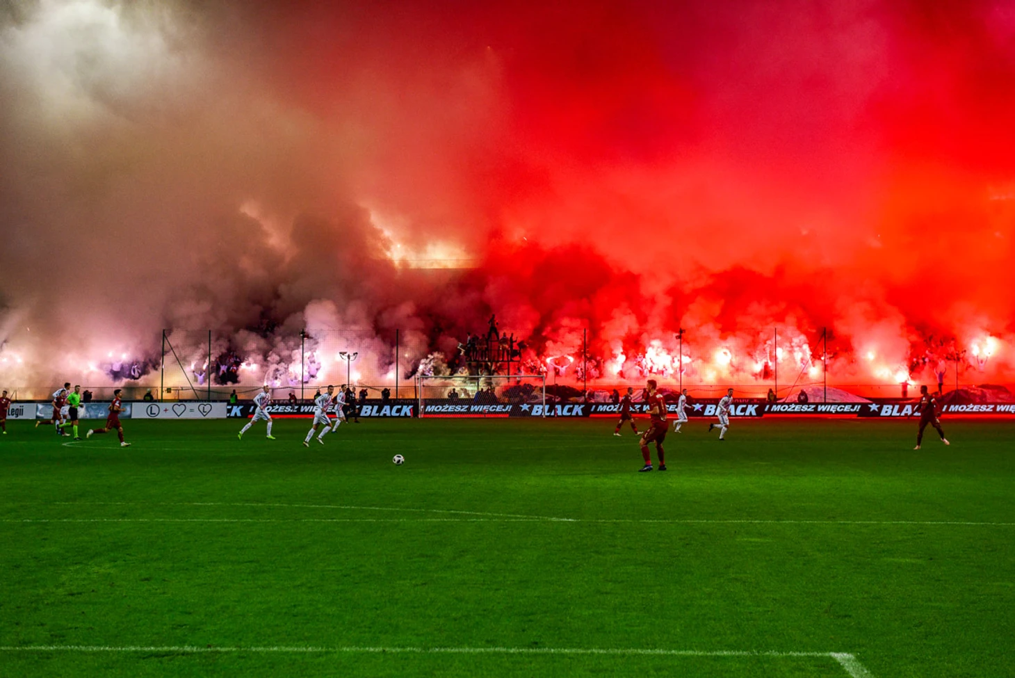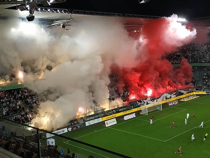 Очень крутое дымовое шоу фанатья "Легии" в красно-белых цветах польского флага!