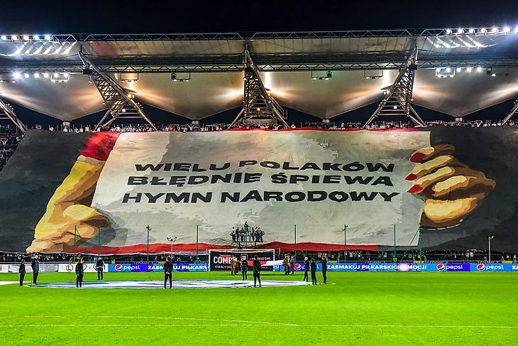 В минувшую субботу на домашнем матче против "Гурника" из Забже фэны варшавской "Легии" презентовали перфоманс на патриотическую тему. Его тематикой стал гимн Польши, а точнее правильность его исполнения - поляки поют свой гимн, используя в одном месте 2 разных слова.