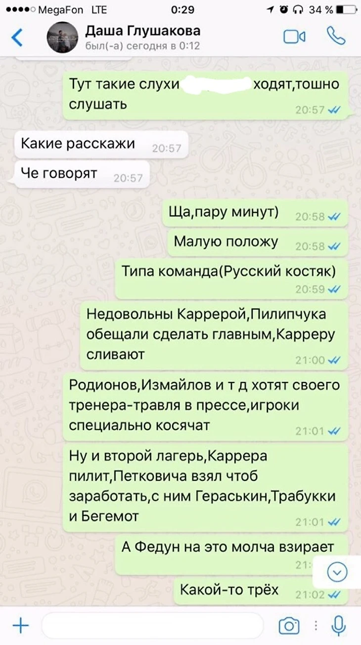 В них Дарья снова подтверждает слив тренера частью «авторитетных» игроков (под «авторитетными» подразумевается всё та же «Ромашка»), а также упоминает о предстоящем продлении контракта с ее мужем. Эти 2 части – про слив тренера и продление контракта – она связывает упоминанием Наиля Измайлова, который был если не инициатором слива Карреры, то всячески этому способствовал. Также Дарья говорит о том, что всё написанное в этом чате вторым человеком в качестве вопросов и предположений Денис лично подтверждает. И с некоторым сожалением говорит, что в сливе Карреры участвуют не все футболисты («Игроки не особо косят, не все косят») и что это всё отражается на игре команды. Также она после «согласования» с мужем уточняет, что на тот момент команда не хотела видеть Романа Пилипчука следующим главным тренером.