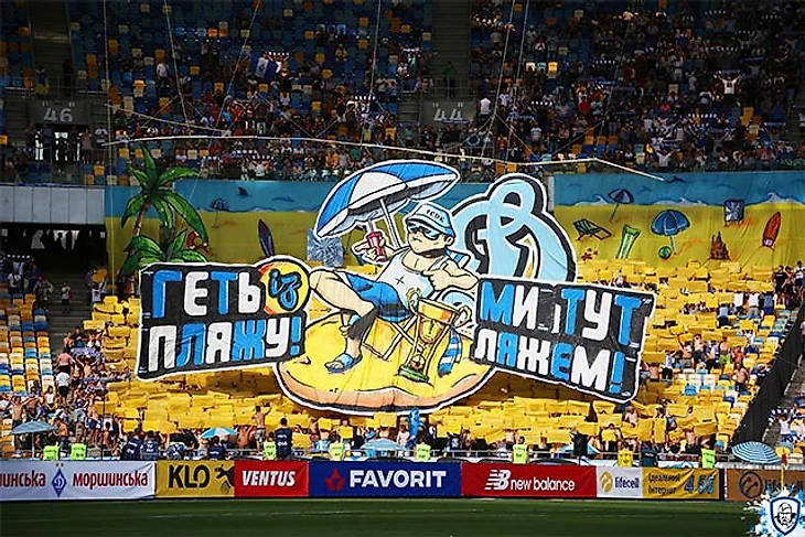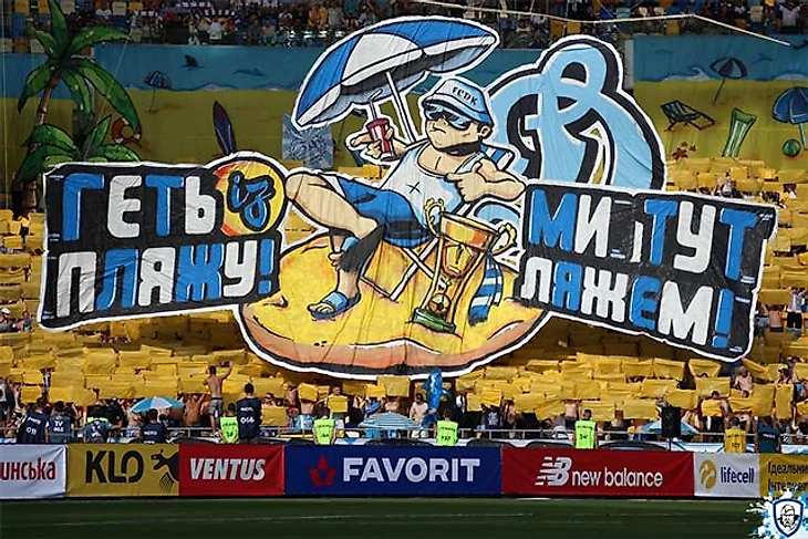 С началом матча фан-сектор окрасился в песочный цвет благодаря желтым модулям, а с козырька над фанатской трибуной был спущен очень крутой баннер с отдыхающим на лежаке фэном "Динамо" и подписью "Вон с пляжа! Мы тут ляжем!". Дополнили баннер нарисованный кубок и литера "Д" на заднем фоне. В общем, в русской вариации это был бы перфоманс "На*уй с пляжа!".