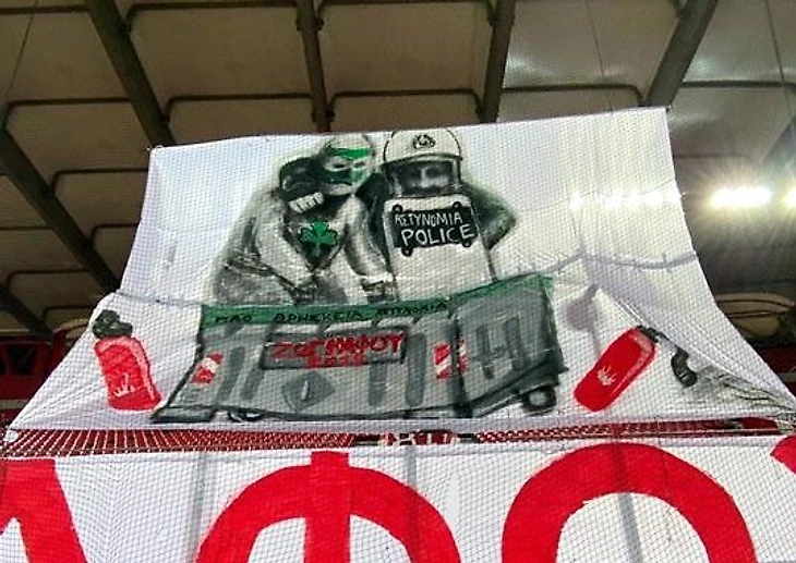 На баннере были изображены фанаты «Панатинаикоса» в обнимку с полицейским, обороняющиеся от нападения.