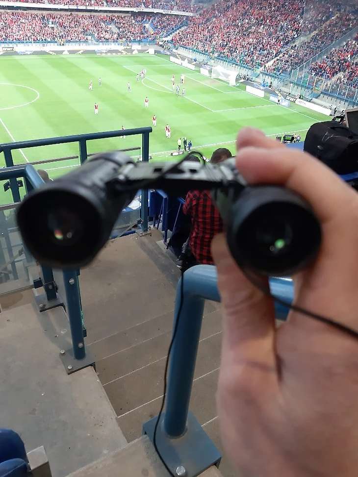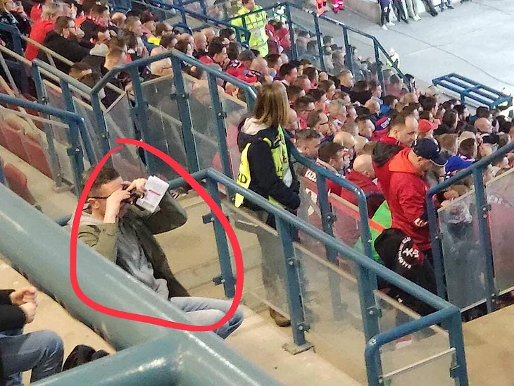 Интервью у него брал польский журналист Симон Ядчак, который славится своей нелюбовью к фанатам. На фото ниже вы можете посмотреть, как Симон "смотрит" футбольный матч – его взгляд устремлён не на поле, а на фанатскую трибуну "Wisla Sharks", причём он смотрит за ними в БИНОКЛЬ. А потом пишет твиты из серии "Фанаты "Вислы" поют антисемитские песни во время матча".
