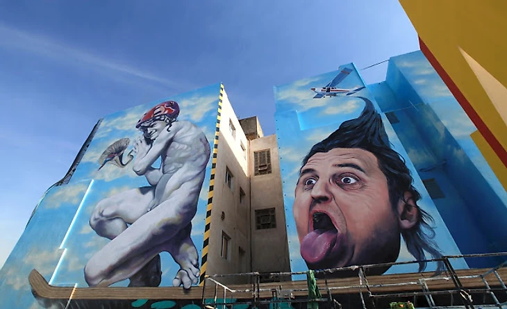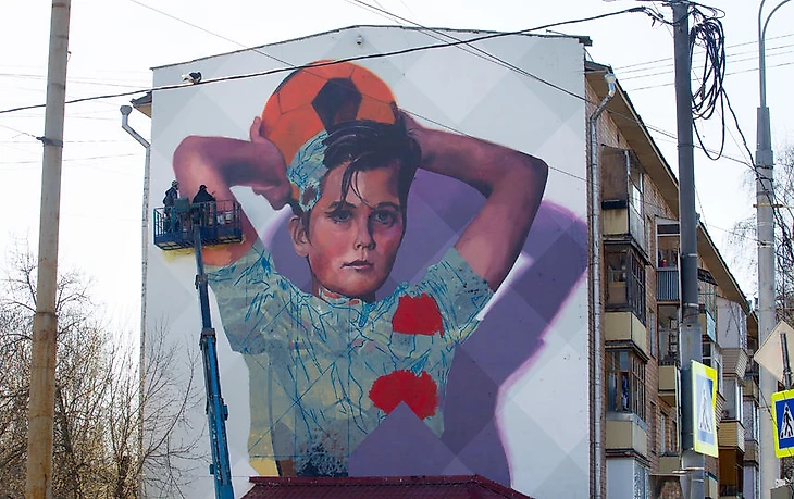 Ну а непосредственно на мундиале Мартин добрался и до России, где создал 2 масштабные работы. Первая – на фасаде обычного жилого дома в Москве по адресу Тверская, 13.
