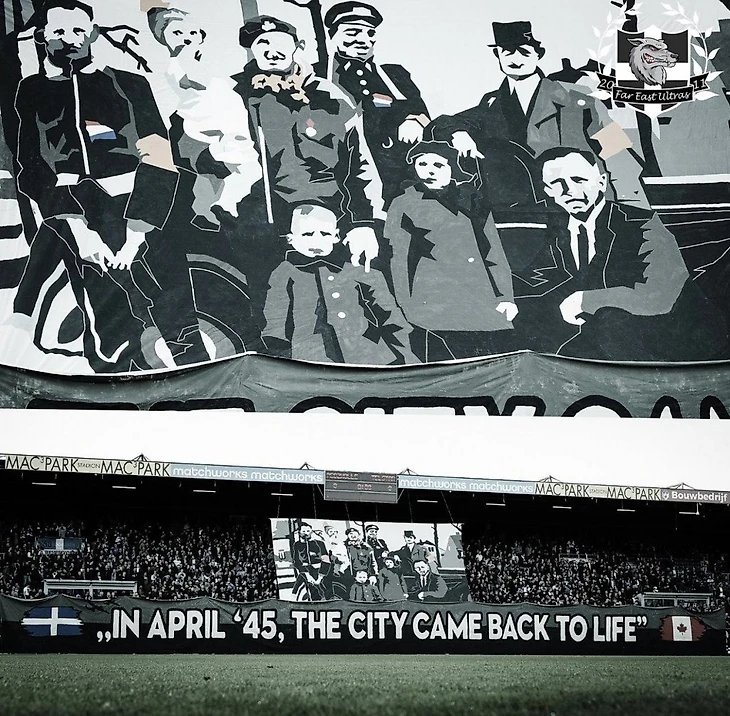 "В апреле 45-го город вернулся к жизни" – гласит перфоманс фанатов "Зволле" из группировки "Far East Ultras".
