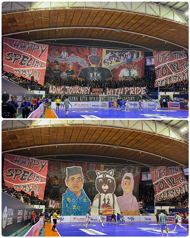 Но то, что я увидел на прошлой неделе, поразило даже меня. Как вам, например, вот такой перфоманс на футзальном матче двух школьных команд старших классов в городе Сурабая? Перфоманс, кстати, посвящен 12-летию школы №1, а у этой школы есть даже собственная фанатская фирма, носящая название «Smeas Mania».