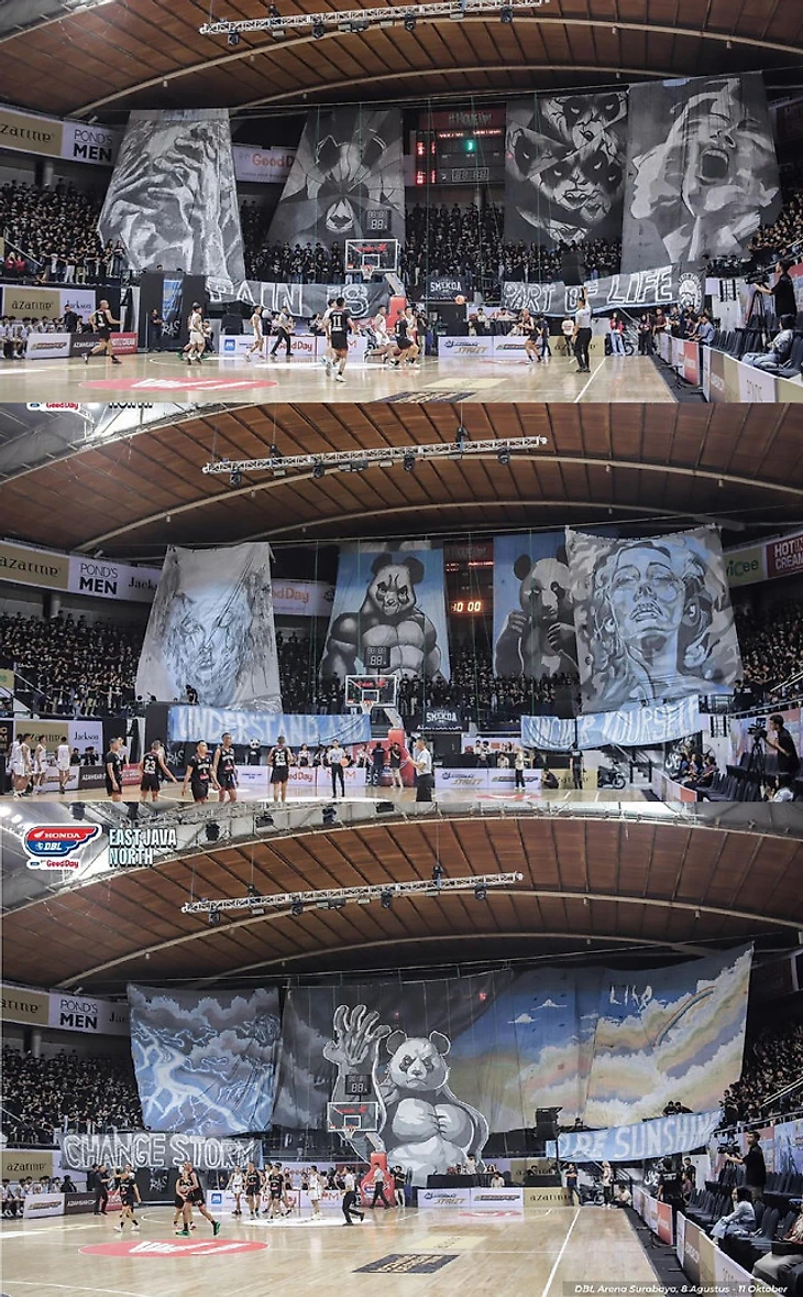 Ну и закроем этот блок самыми милыми азиатскими животными — пандами. Такой многосерийный перфоманс был сделан на баскетбольном матче между учениками сурабайской школы №2 и школы №1 города Вару. Только вот посыл в перфомансах был не умиляющим, чего обычно ожидаешь от картинок с пандами, а скорее какой-то философский: «Боль — это часть жизни», «Пойми и познай себя» и «Смени бурю на солнечный свет».