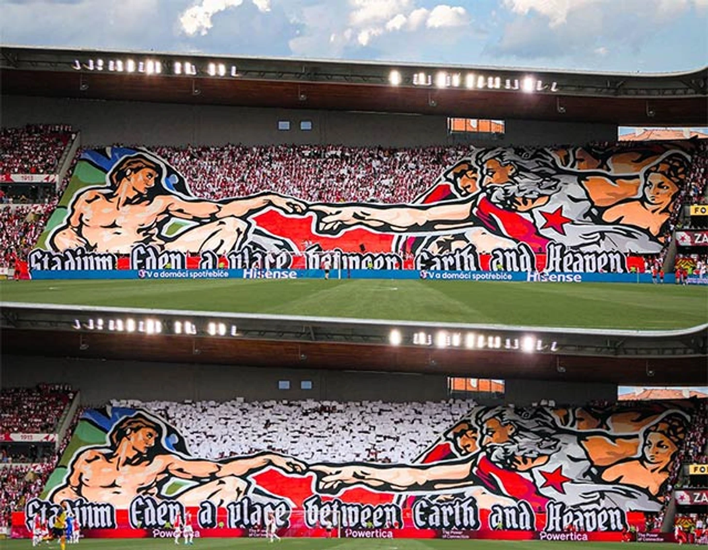 Ну и закончить сегодняшний обзор хотелось бы на позитивной ноте, а именно минуткой прекрасного из Праги, где в рамках квалификации Лиги Чемпионов «Славия» принимала бельгийский «Юнион». Ультрас пражан сделали свой перфоманс по мотивам знаменитой фрески Микеланджело «Сотворение Адама», написанной около 1511 года и расположенной в Сикстинской капелле в Ватикане. «Стадион «Эден» — место между землей и небом» — таким был посыл чешских болельщиков в своем творении.