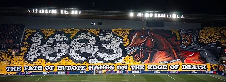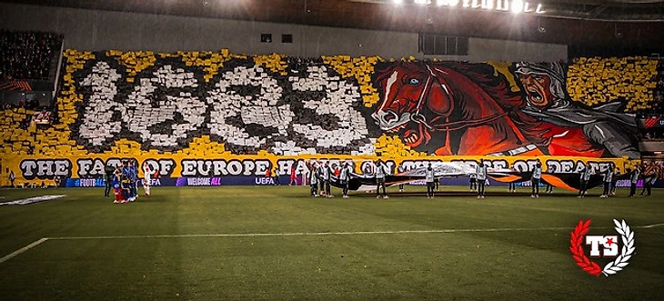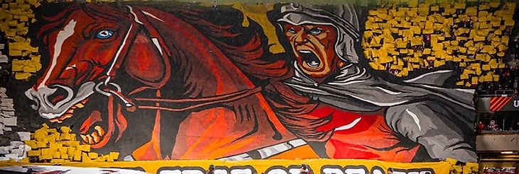 С Лиги Чемпионов переместимся на ее младшую сестру – Лигу Европы, чтобы в очередной раз поговорить об ультрас пражской «Славии», которых мы вспоминаем почти в каждом нашем еженедельном обзоре. На сей раз чехам противостоял турецкий «Фенербахче», с которым «Славия» соседствовала в болоте турнирной таблицы, так что для возможности продолжения борьбы обеим командам нужна была только победа. Поэтому фанаты пытались зарядить своих футболистов после двух гостевых поражений от «Айнтрахта» и «Атлетика» из Бильбао только на победу, использовав для этого красочную хореографию с разъяренным всадником и лозунгом «1683. Судьба Европы висит на волоске от смерти».