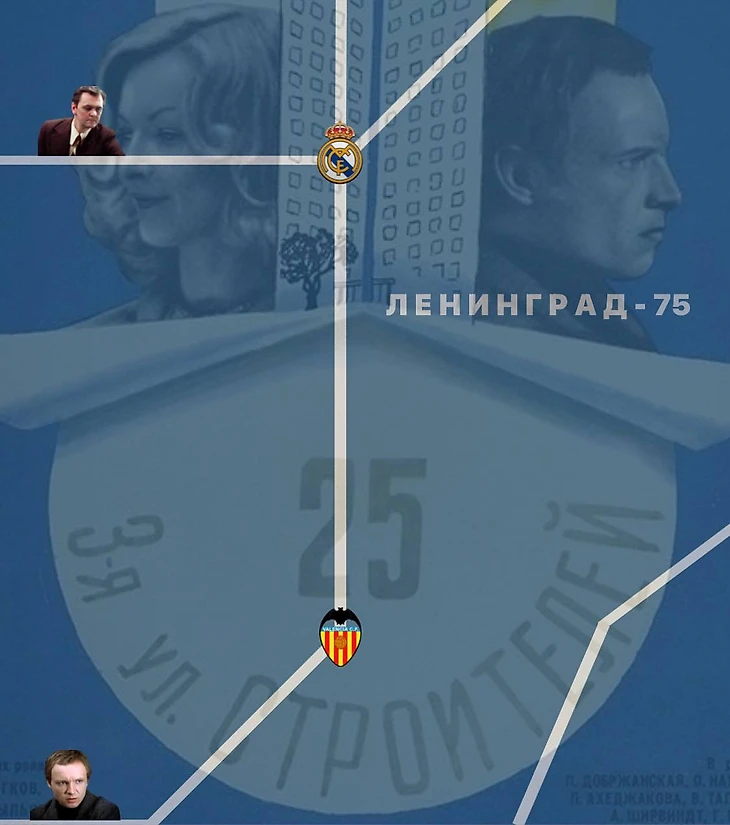 История простая: «Калдырхан» заменил «Валенсию» в парижском финале Лиги Чемпионов 2000 года против испанского «Реала» на основе принципа альтернативного варианта в рамках механизмов «обратной ленты», придуманной тобой Исаак. Cледом мы перевели главную битву в неудобное для Мадрида пространство – Ленинград 1975 года. Ровно тогда случилась встреча Жени Лукашина, и Иполлита, героев культовой новогодней саги «Ирония Судьбы».