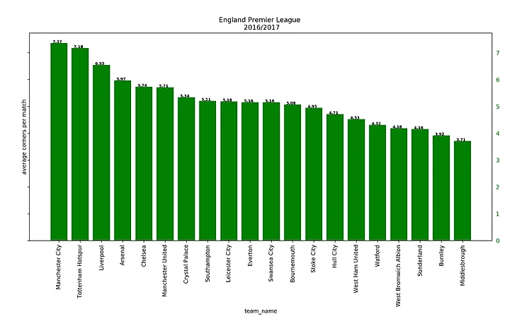А теперь посмотрим на каждую лигу в отдельности. Налицо тренд: "команды из верхней половины турнирной таблицы зарабатывают угловые чаще". Бывают исключения, но в большинстве случаев этот тренд угадывается.