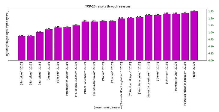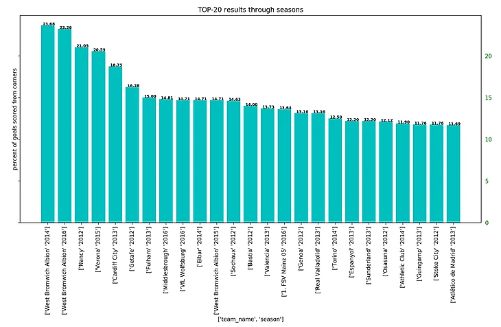 А теперь давайте посмотрим на противоположный график - топ-20 результатов с наибольшим процентом голов с угловых.