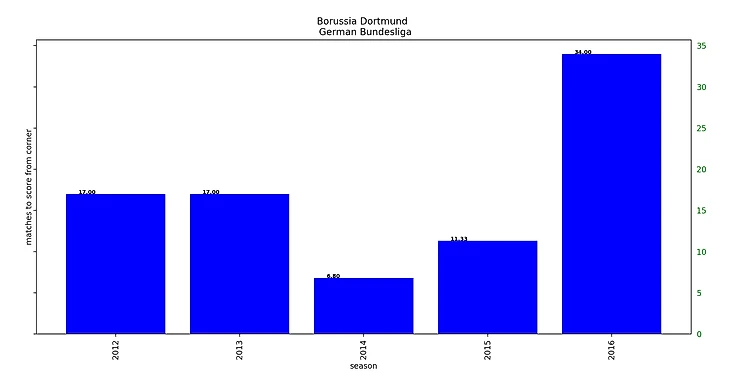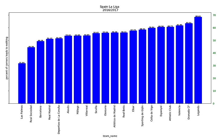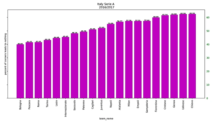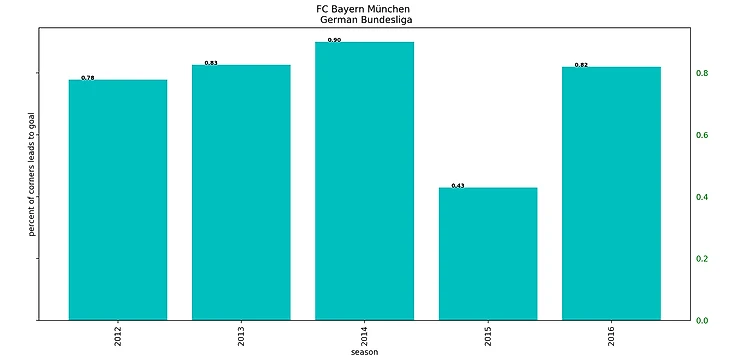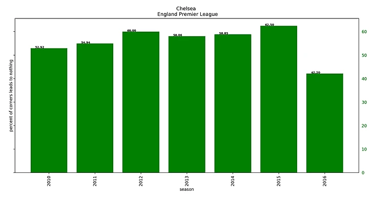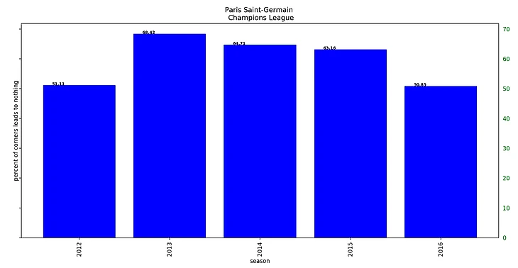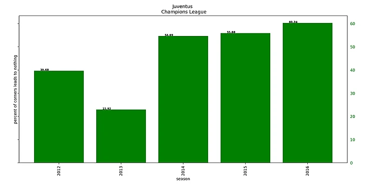 Забавно, что такой высокий процент успешных угловых был достигнут при максимальном браке (68% потерь мяча) при подаче угловых за 5 сезонов.