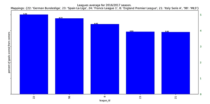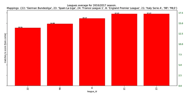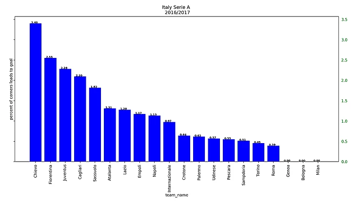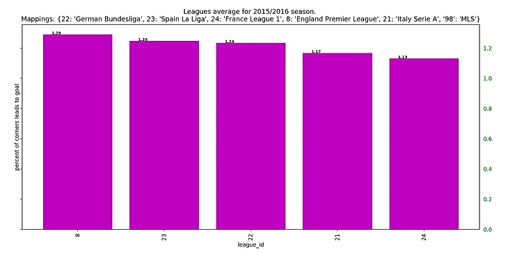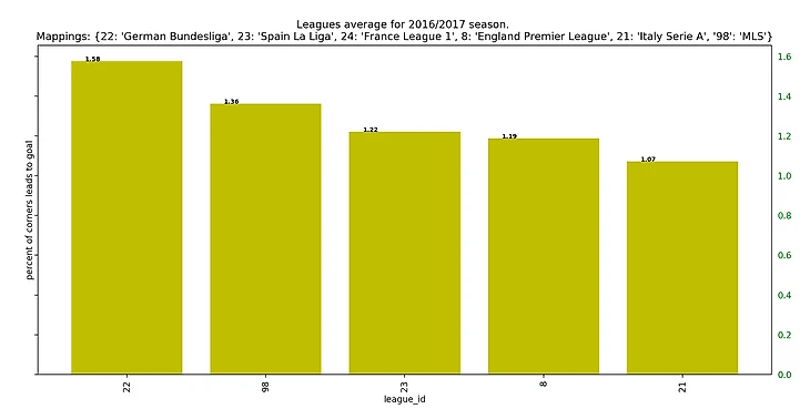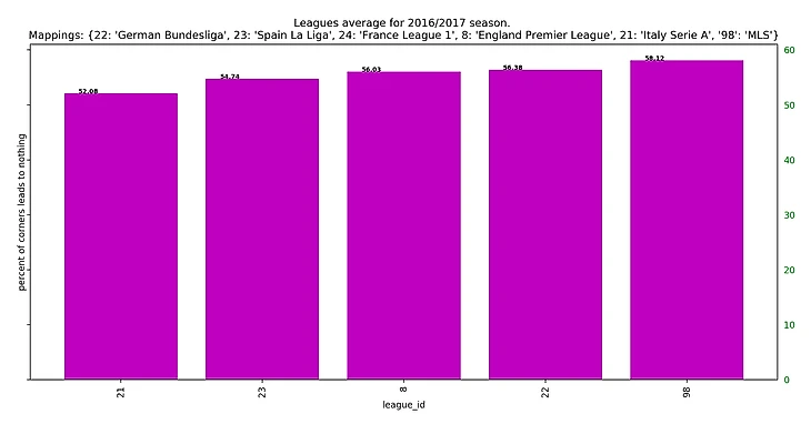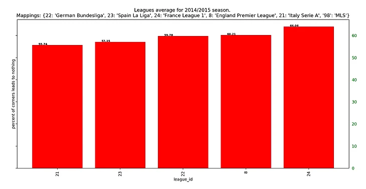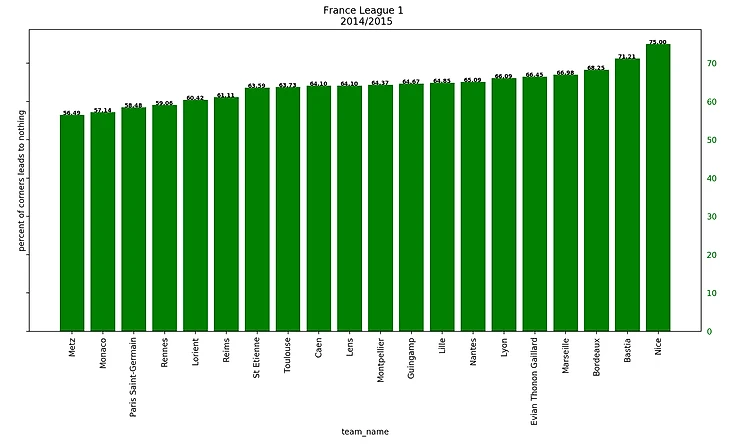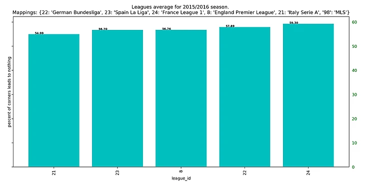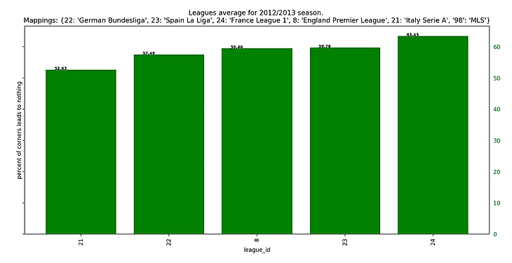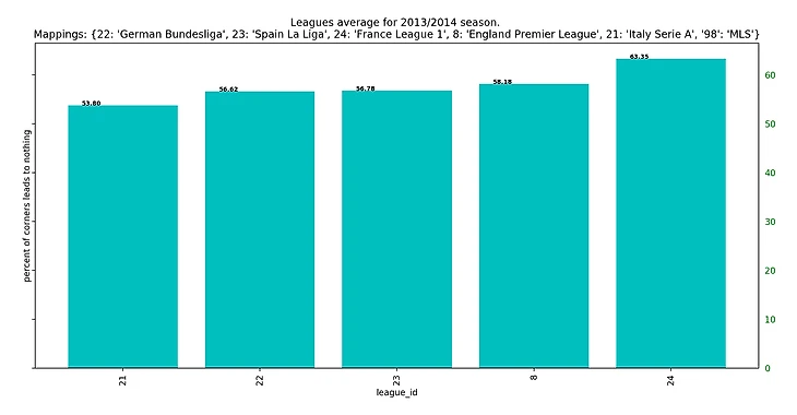 Если посмотреть на результаты последних 5 сезонов, то получится забавная закономерность: у француского чемпионата каждый год самый высокий процент брака на угловых, а у итальянского - самый низкий.