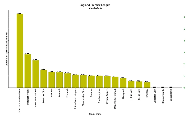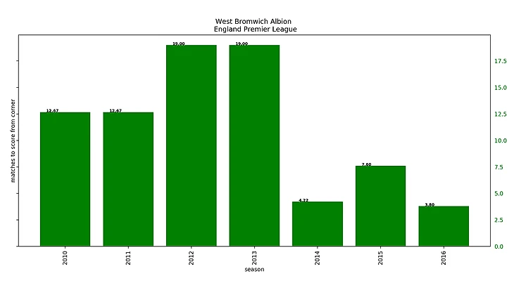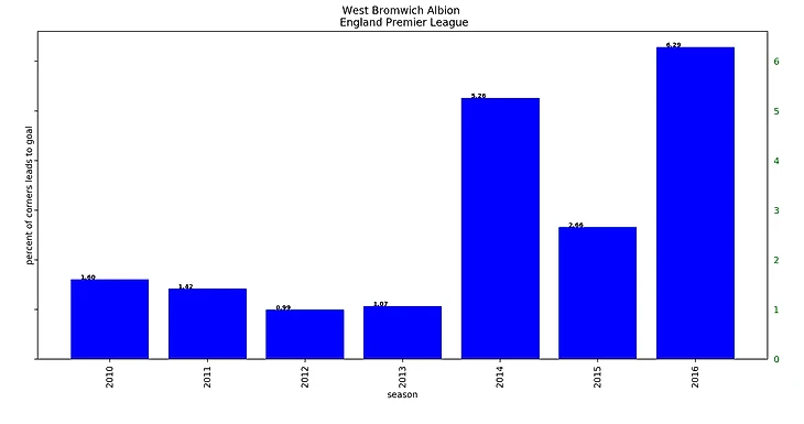 Я думаю, любой фанат Вест Бромвича хочет такой график себе на стену. Среди 20 команд Вест Бромвич проскальзывает трижды! И безоговорочно занимает первые 2 места. То есть, целых 2 сезона они забивали почти четверть голов ударами после угловых! А еще в одном сезоне – седьмую часть голов. Оказывается, для некоторых команд угловые играют очень важную роль и влияют на их результат.