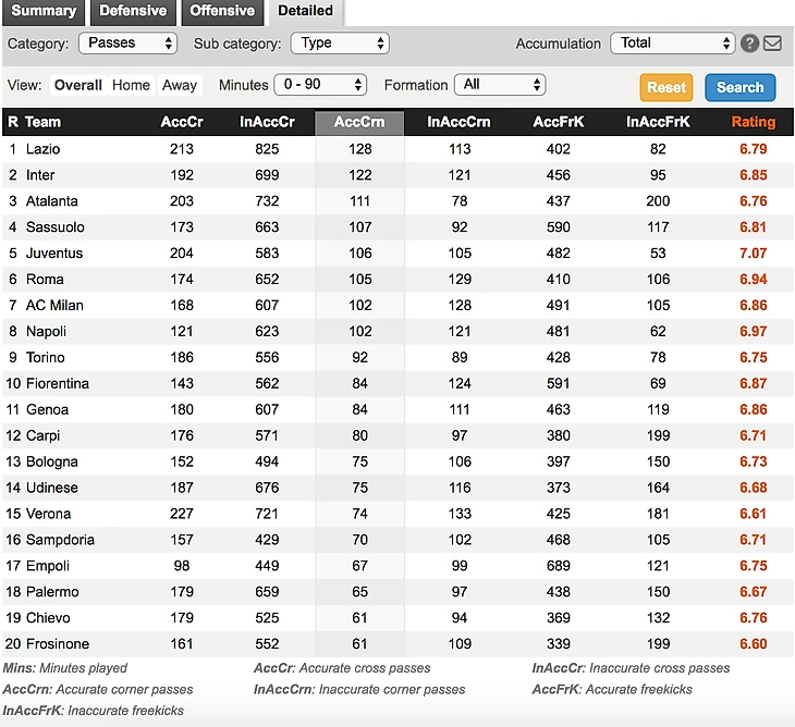На whoscored количество данных больше (большее покрытие лиг и сезонов), но они уже предагрегированы (посезонно). Правда, нет отдельного раздела, посвященного угловым, но если поковыряться во вкладках, то можно найти разрозненную инфу по разным характеристикам угловых. Представлена она в табличном варианте - вот так: