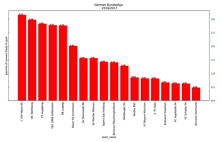 Бавария в течение 5 сезонов стабильно имеет меньше 1%. На их угловых можно смело выходить покурить :)