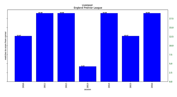 Но у отдельных команд бывает повеселее. Например, лучший сезон Роджерса в Ливерпуле - как яркое пятно. Гол раз в 4 матча при обычной практике в 13-19 матчей! Хотя они тогда просто забивали больше обычного, что, как видим, отразилось и на голах с угловых. (Сезоны на графиках обозначаются годом начала сезона. Например, сезон 2013-2014 обозначается как 2013)