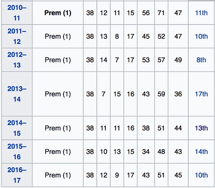 Люди в Вест Броме себе спокойно жили, не знали горя. Их команда забивала с угловых по 2-3 раза за сезон, пока, ВНЕЗАПНО, на них не обрушилось подписание Тони Пьюлиса в середине сезона 2014\2015. Вест Бром резко начал забивать с угловых чаще, что, однако, никак не повлияло на их позицию в чемпионате (даже слегка ухудшило ее - смотри таблицу ниже; последняя колонка – занятое по итогам сезона место). А общее количество забитых голов вообще уменьшилось (четвертая колонка справа)