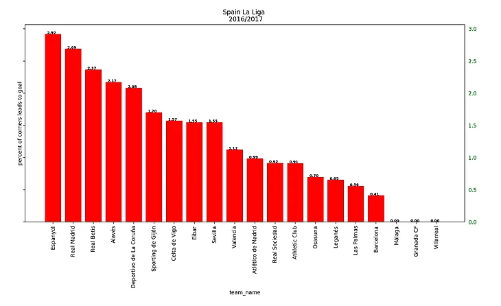 Эйбар в сезоне 2014/2015 - 14.7% голов с угловых (они заняли 18-е место и должны были вылететь, но избежали вылета из-за финансовых проблем у Эльче)