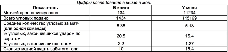 За основу они взяли 134 матча АПЛ сезона 2010/11, в которых было подано 1434 угловых. В итоге у них получились пугающие результаты: 80% угловых вообще не заканчиваются ударом по воротам. А из оставшихся 20%, доведенных до удара, только 10% завершаются голами. (То есть, из 100 угловых команда в среднем забивает в 2 из них) Как итог: в среднем команда забивает с углового раз в 10 матчей.