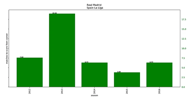 У Реала всегда приятные болельщику показатели (от 3 до 7 матчей), кроме сезона 2013-2014 (19 матчей). Это был первый сезон Карло Анчелотти. Неужели это Моуриньо оставил после себя выжженую землю? Думаю, нет. Они тогда ЛЧ выиграли, а в чемпионате вообще забили больше всех голов – просто не после кроссов с угловых :)