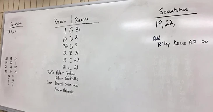 Когда Грегори и Райан заходят в комнату для скаутов на арене в Брэндоне, они располагаются за большим столом. Каждый достает свой блокнот и начинает записывать составы на игру. Они уже написаны на большой доске, что стоит в комнате. Также каждый скаут получает специальный пресс-релиз.