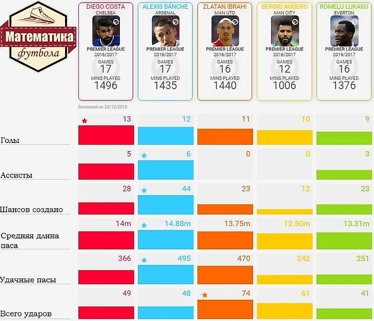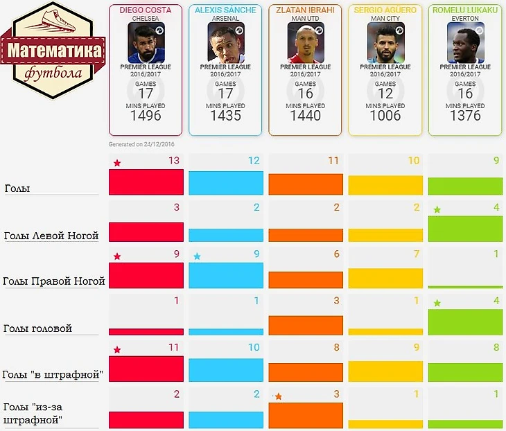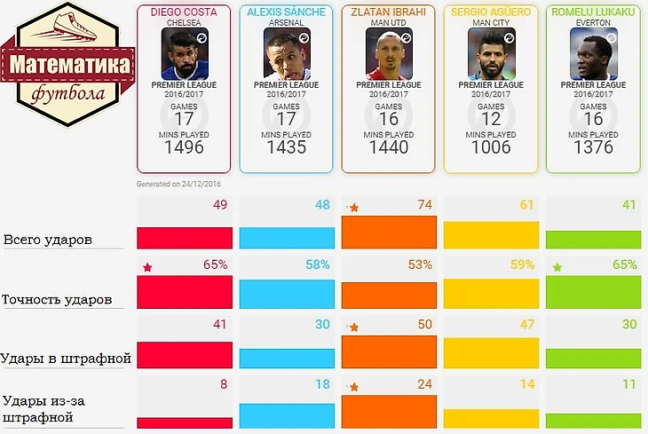 И вот тут показатели Златана уже не выглядят столь впечатляющими. Да и Агуэро уже не так круто выглядит, хотя и забивает раз в 100 минут. Вы только вдумайтесь, у Ибрагимовича в среднем 4,6 удара за матч! В прошлом сезоне, когда он божил в ПСЖ, у него был показатель 4 удара/гол. Определенно сказывается уровень лиги. Сейчас же 4 удара для гола требуется Санчесу. Лидером является лидер. Косте нужно нанести меньше 4-х ударов, чтобы забить гол.