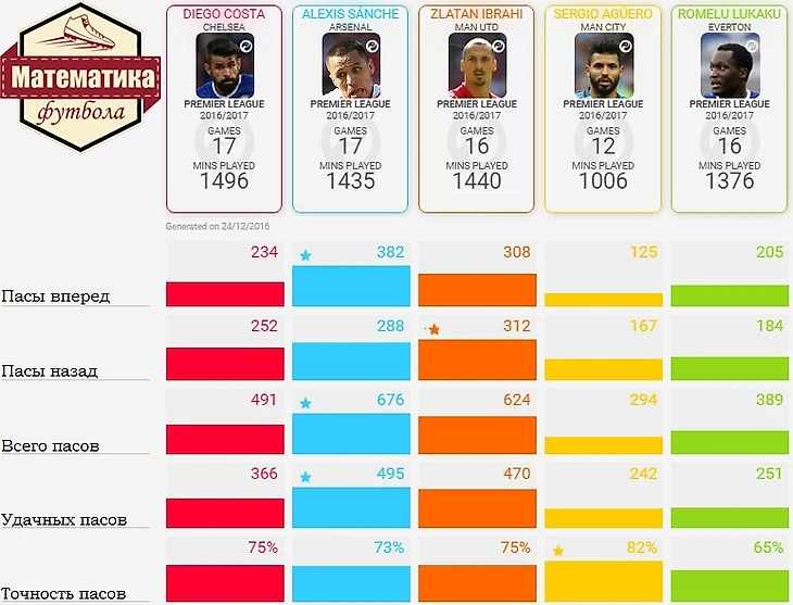 А вот лучший показатель по пасам у Санчеса, за ним идет Ибра. Очень примечательно, что у Санчеса и Ибрагимовича такой разрыв с остальными игроками по пасам вперед. Это означает, что оба игрока отходят ближе к центру, чтобы потом помогать разгонять атаки команды. А вот Агуэро ждет пока пас отдадут на него. Лукаку же выглядит самым слабым распасовщиком из всех.