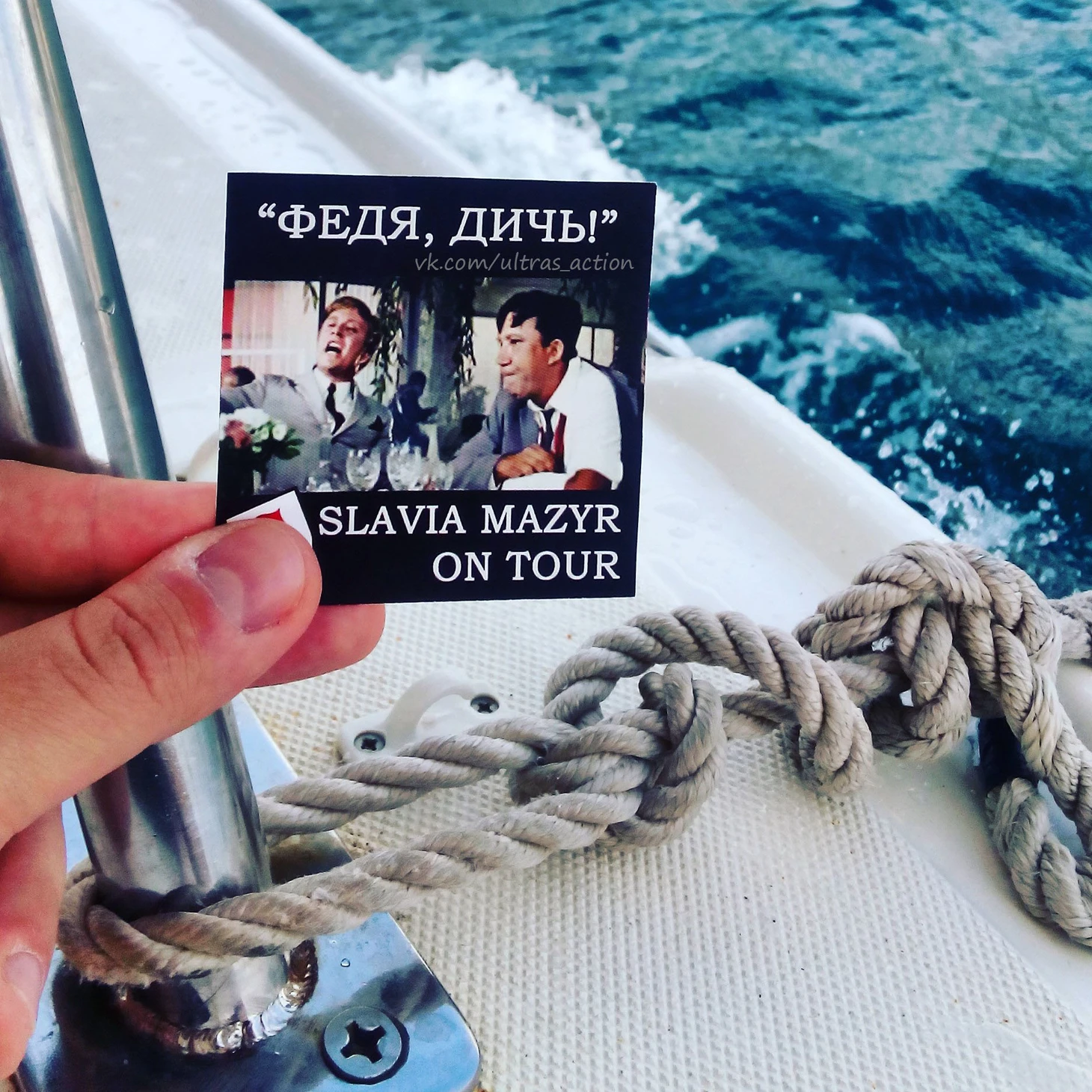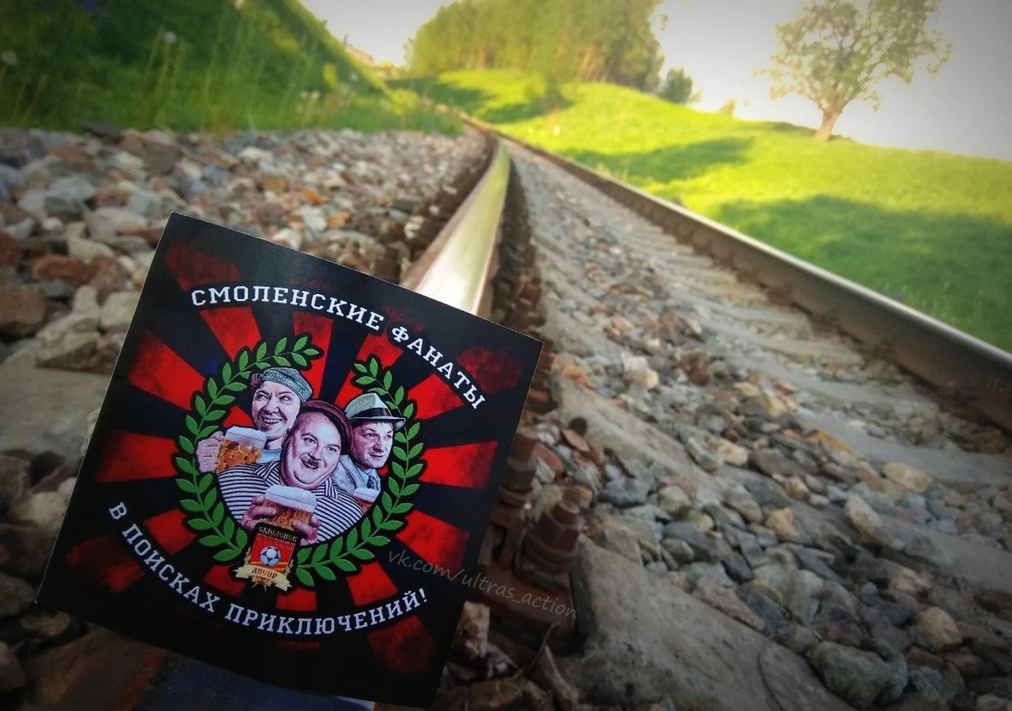 А это милый выездной стикер готовых к приключениям фанатов смоленского «Днепра». Балбес, Бывалый и Трус – классические роли Юрия Никулина, Евгения Моргунова и Георгия Вицина в фильмах Гайдая