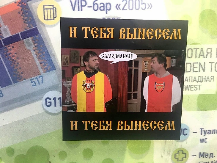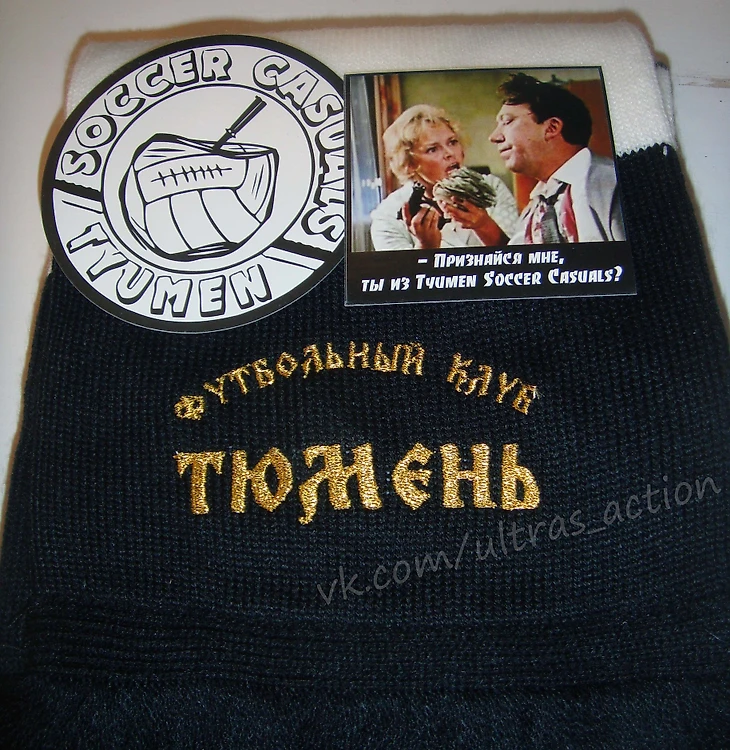 А фанаты «Тюмени» записали Семена Семеныча в члены своей банды «Tyumen Soccer Casuals». На наклейке – эпизод, когда жена Горбункова разбудила мужа после пьянки в ресторане, чтобы узнать, откуда у него появились огромная сумма денег и пистолет.
