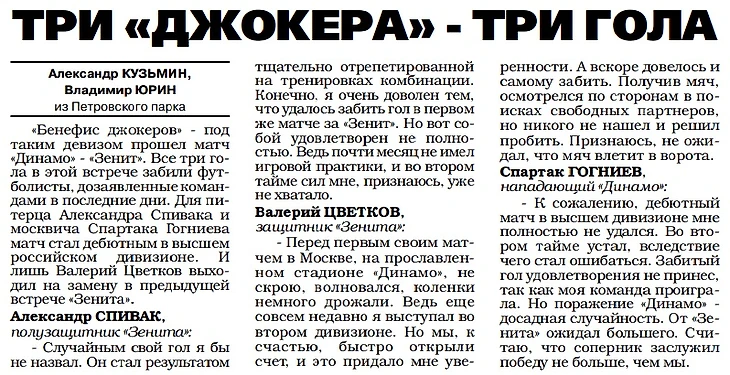 Правда, матч с «Динамо» не был первым для Цветкова. За 10 дней до игры в Москве он вышел на замену в игре с «Факелом», а затем поучаствовал в разгроме словенского «Приморья» в Кубке Интертото. Матч в Петровском парке стал для Валерия дебютным в стартовом составе в чемпионате России.