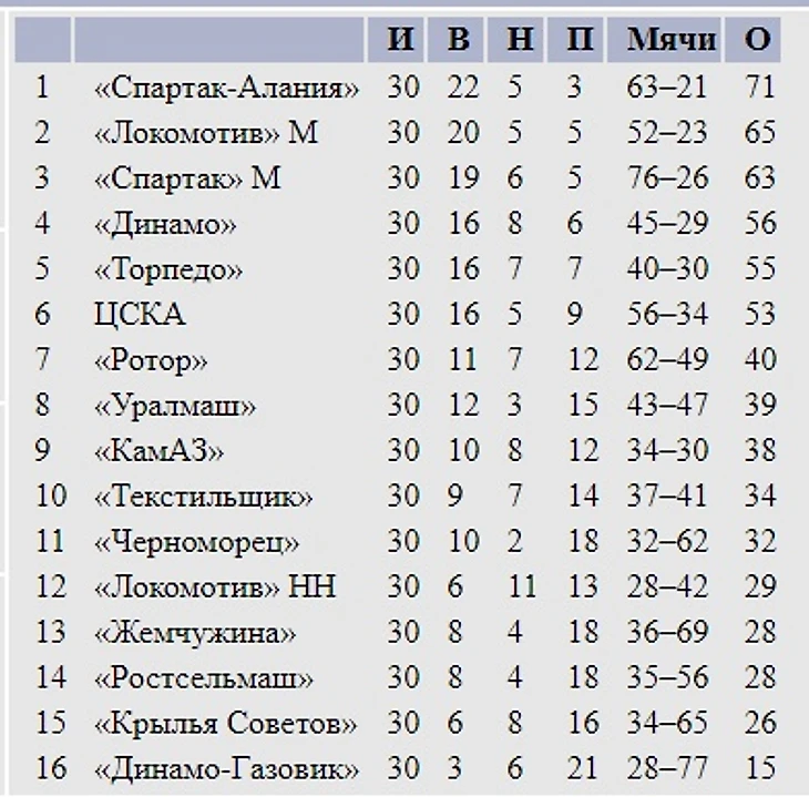Но после выхода в финал Кубка России динамовцы подсдулись и в итоге финишировали четвертыми. Тут-то и взошла «Алания» (ой, «Спартак-Алания») на первое место, с которого уже не сдвинулась. Одним из ключевых матчей для Владикавказа стала игра co «Спартаком» в Москве. Конечно, это был всего 6-й тур, но победа над бессменным чемпионом явно вдохновила команду.