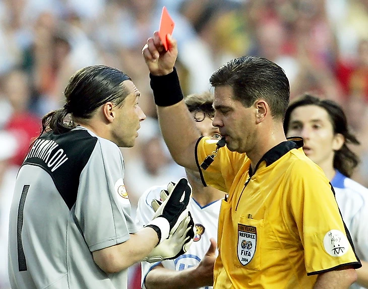 «Сейчас будет удален Овчинников! Он сейчас удалит Овчинникова! Он удаляет Овчинникова! Ну это все!». Норвежец Терье Хауге показывает красную карточку голкиперу сборной России за нарушение, которого не было. Португалия выигрывает 2:0, а Россия первой лишается шансов на плей-офф.