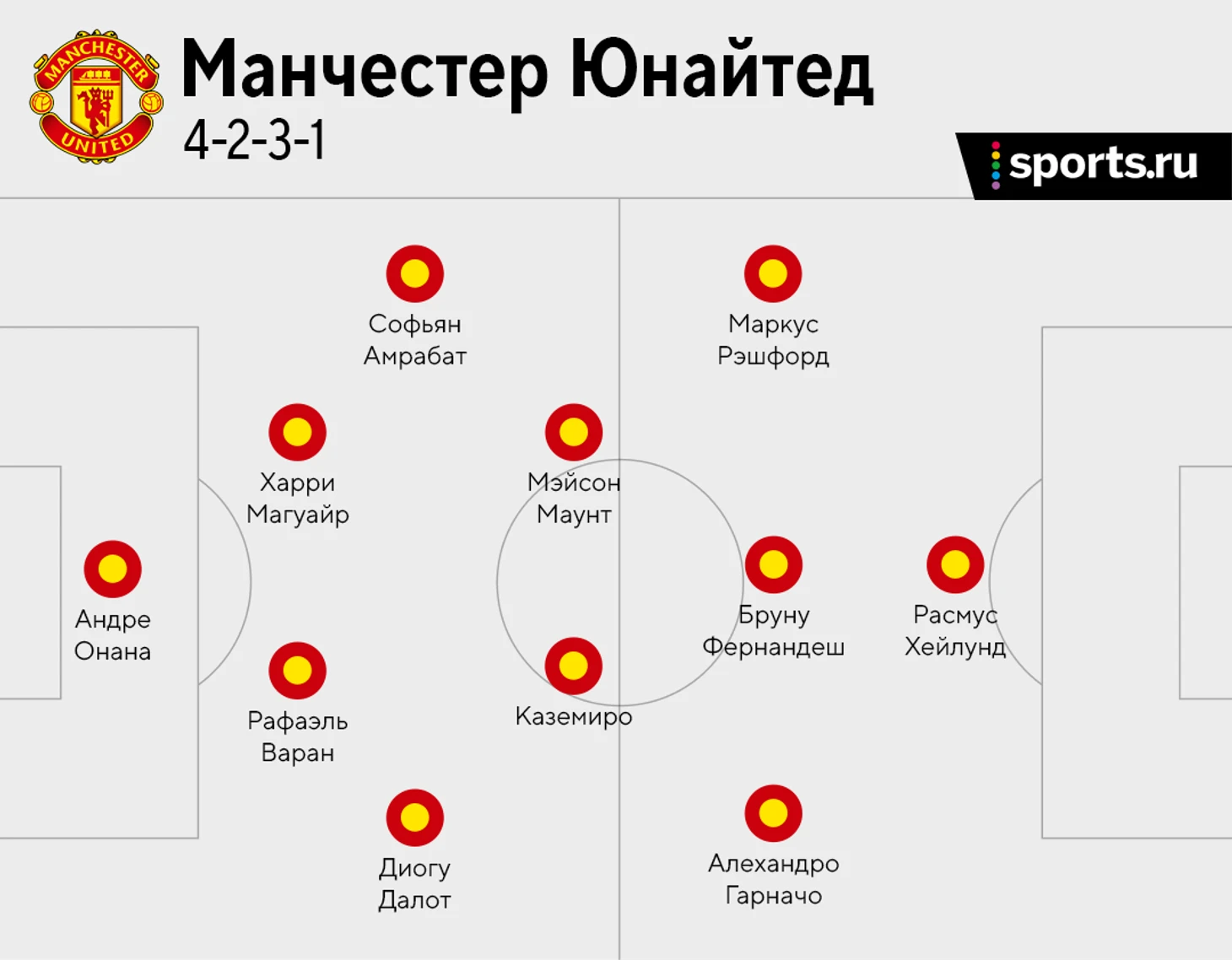 Учитывая игру Амрабата левым крайком, в полузащите снова ожидаем дуэт Каземиро и Мэйсона Маунта. Аннибаль Межбри неплохо прессинговал во вторник, но по итогу провел не самый удачный матч, поэтому третьим в центре должен быть Бруну Фернандеш.