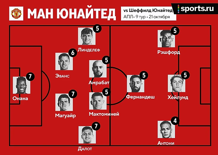 Бруну Фернандеш (5) – у португальца продолжается игровой кризис на клубном уровне. Да, записал на свой счет голевую и несколько передач под удар, но в целом произвел слабое впечатление. В моменте с ассистом все почести отдадим Мактоминею – пас Бруну был настолько небрежным, насколько удар шотландца. Фернандеш часто принимал неоптимальные решения в атаке.